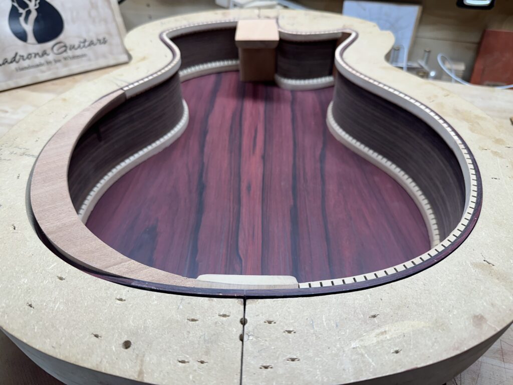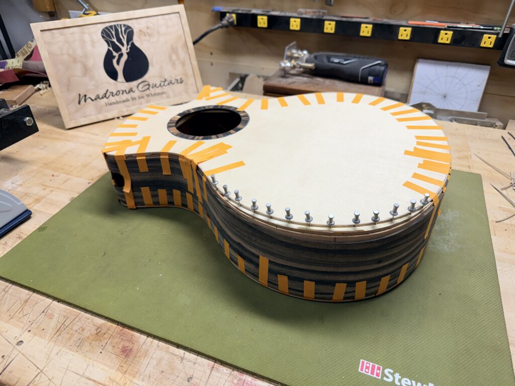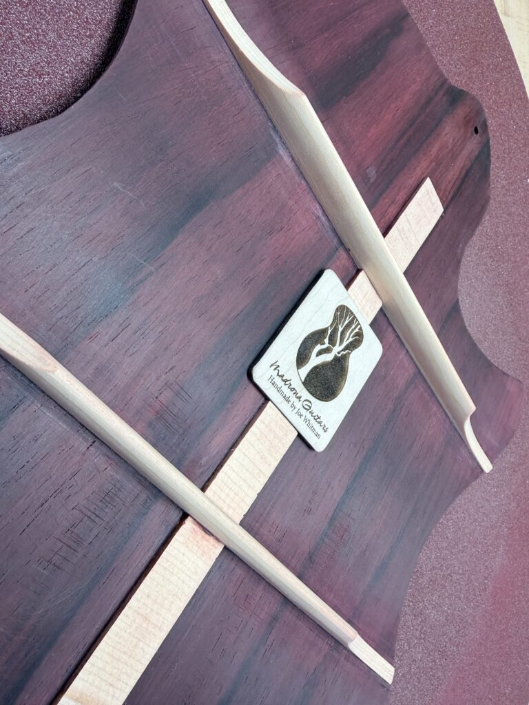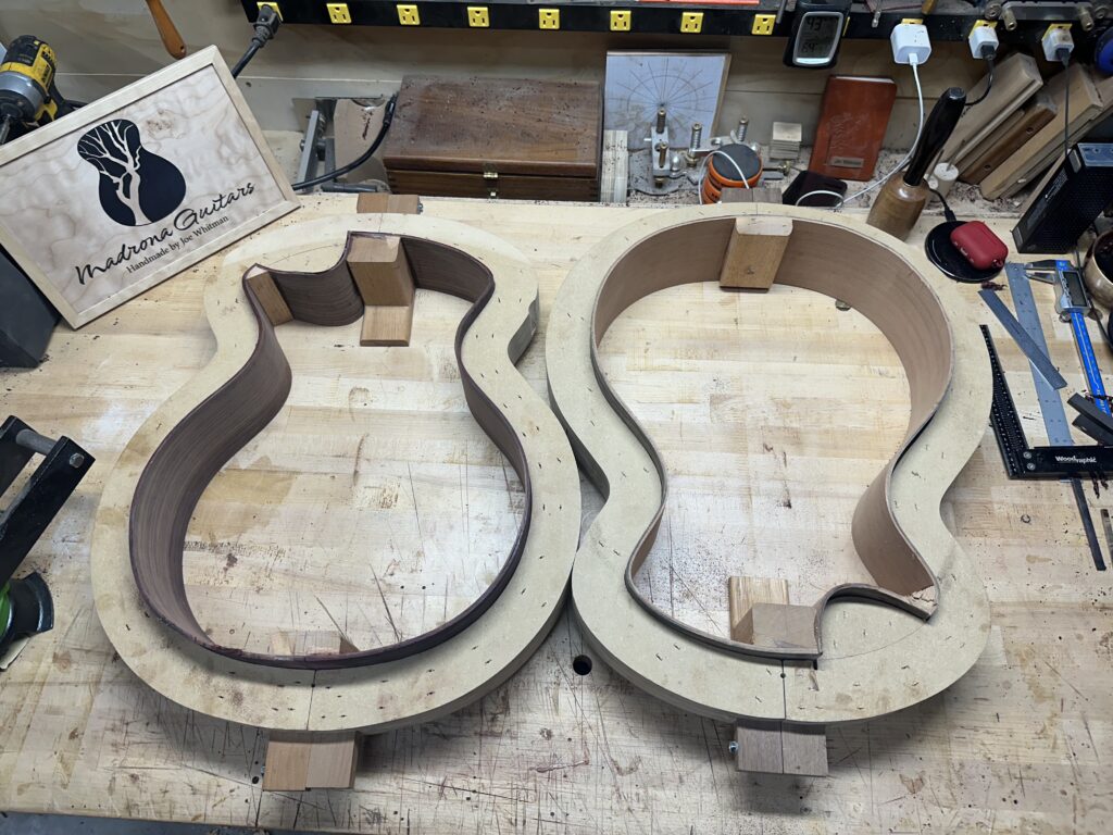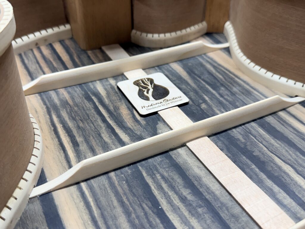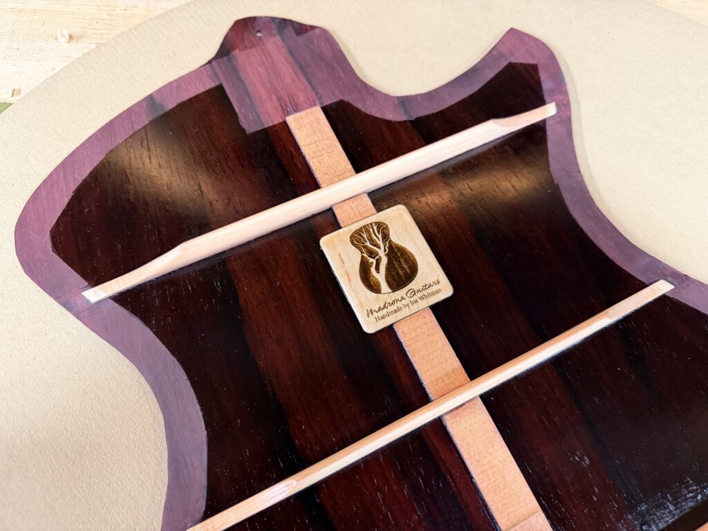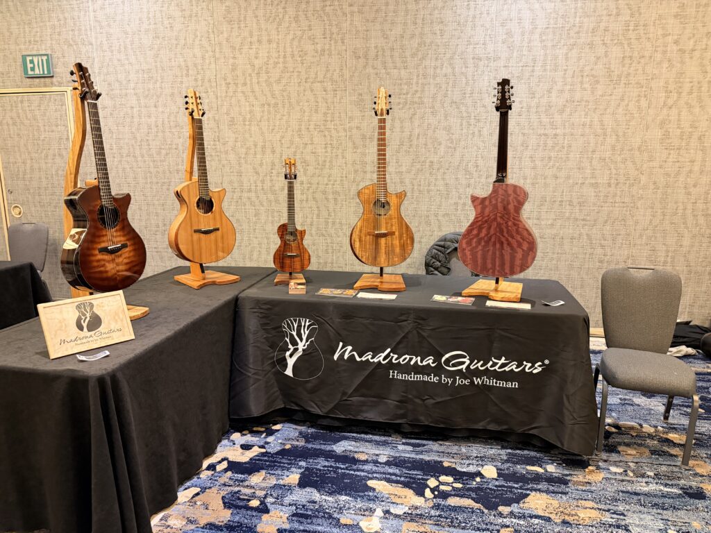 Madrona Guitars Sucia GA shape with Sequoia tree inlay, Ziricote back and sides with Lutz Spruce top. Jumbo acoustic guitar Indian Rosewood, curly Koa binding, curly Redwood top. All Koa concert ukulele with shell inlay of turtles. Handmade Curly Maple Ukulele with curly Koa binding. Handmade Claro Walnut Ukulele with curly Koa binding. Strat Electric Guitar handmade from Maple body, accents in Colobolo and Koa Handmade Handcarved Maple ES-335 Semi-Hollow Electric Arch Top Guitar
