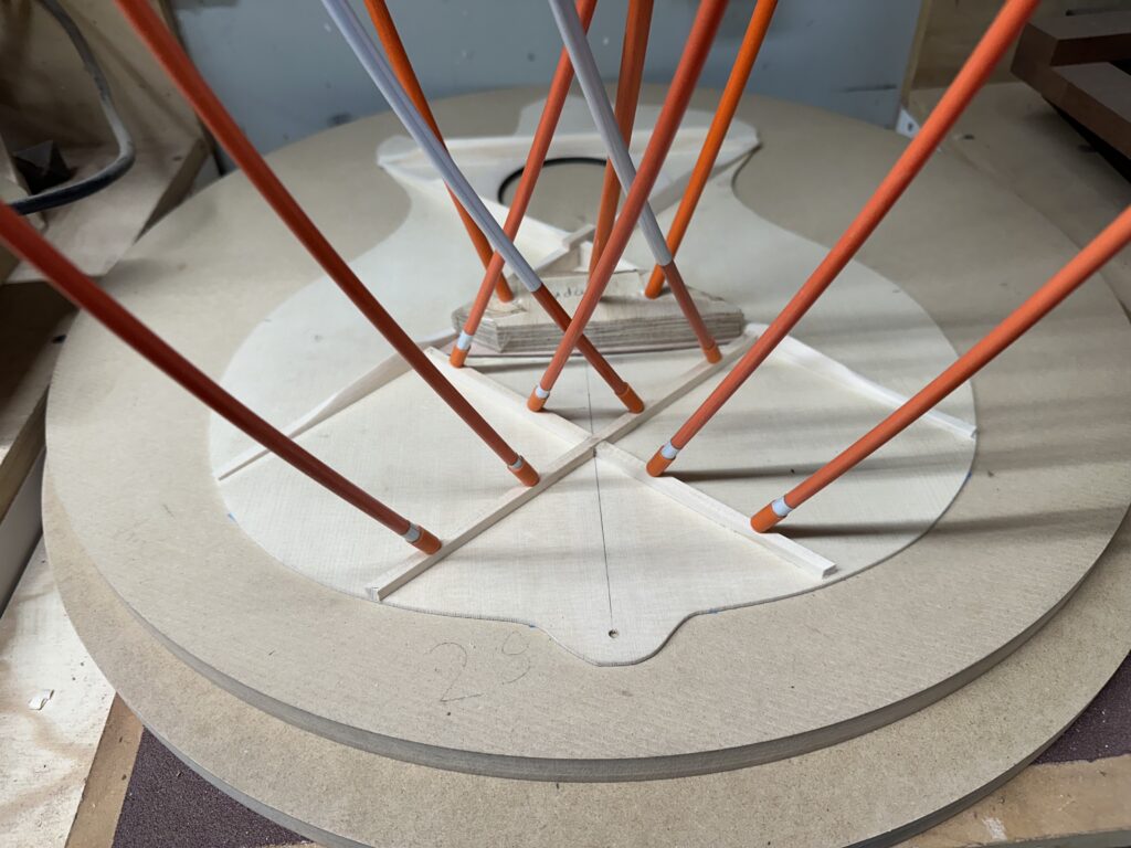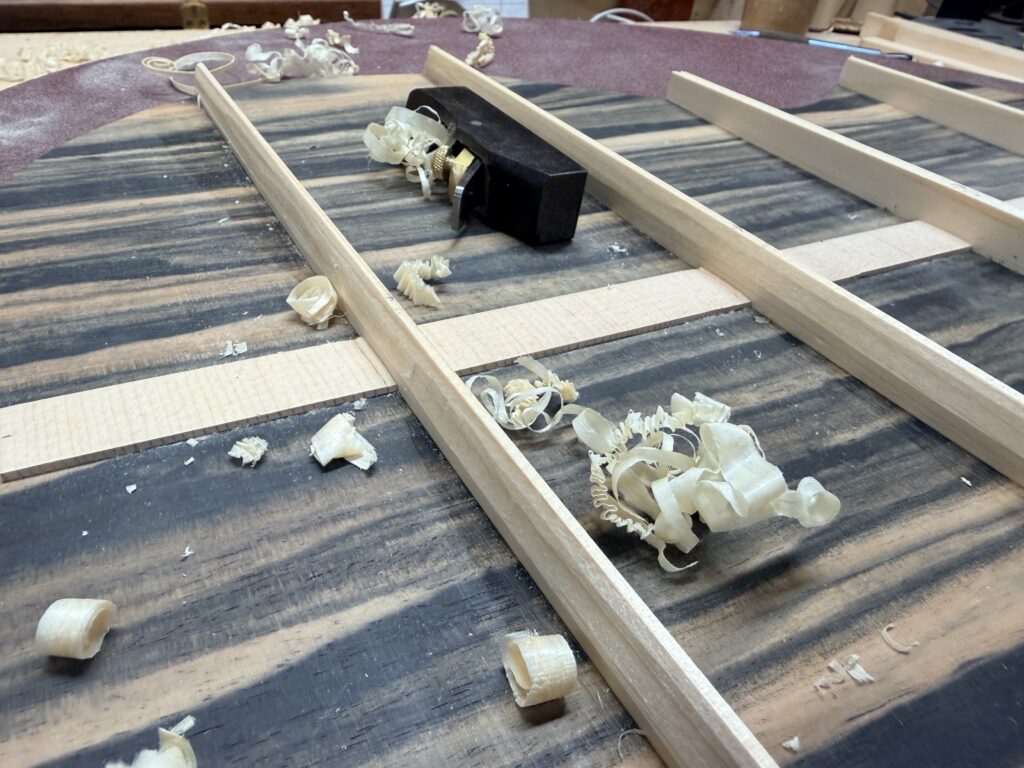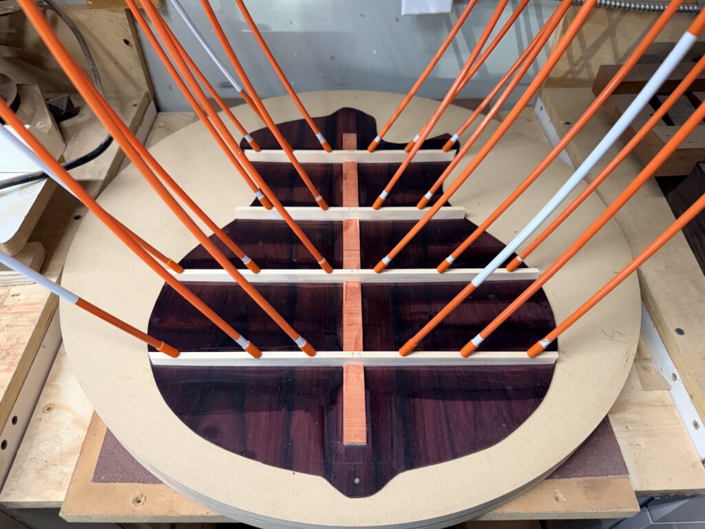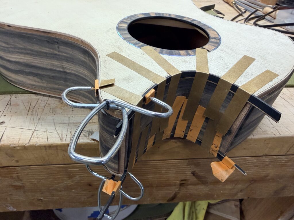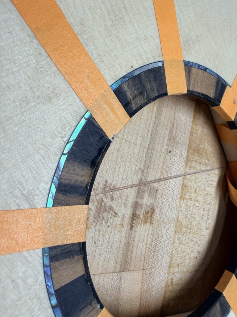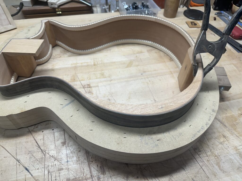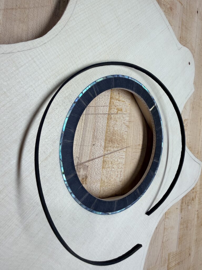 Madrona Guitars Sucia GA shape with Sequoia tree inlay, Ziricote back and sides with Lutz Spruce top. Jumbo acoustic guitar Indian Rosewood, curly Koa binding, curly Redwood top. All Koa concert ukulele with shell inlay of turtles. Handmade Curly Maple Ukulele with curly Koa binding. Handmade Claro Walnut Ukulele with curly Koa binding. Strat Electric Guitar handmade from Maple body, accents in Colobolo and Koa Handmade Handcarved Maple ES-335 Semi-Hollow Electric Arch Top Guitar